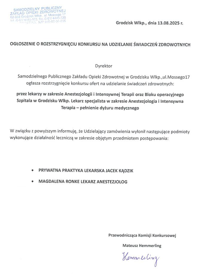 Rozstrzygnięcie konkursu - Lekarze Oddziału Anestezjologii i Intensywnej Terapii
