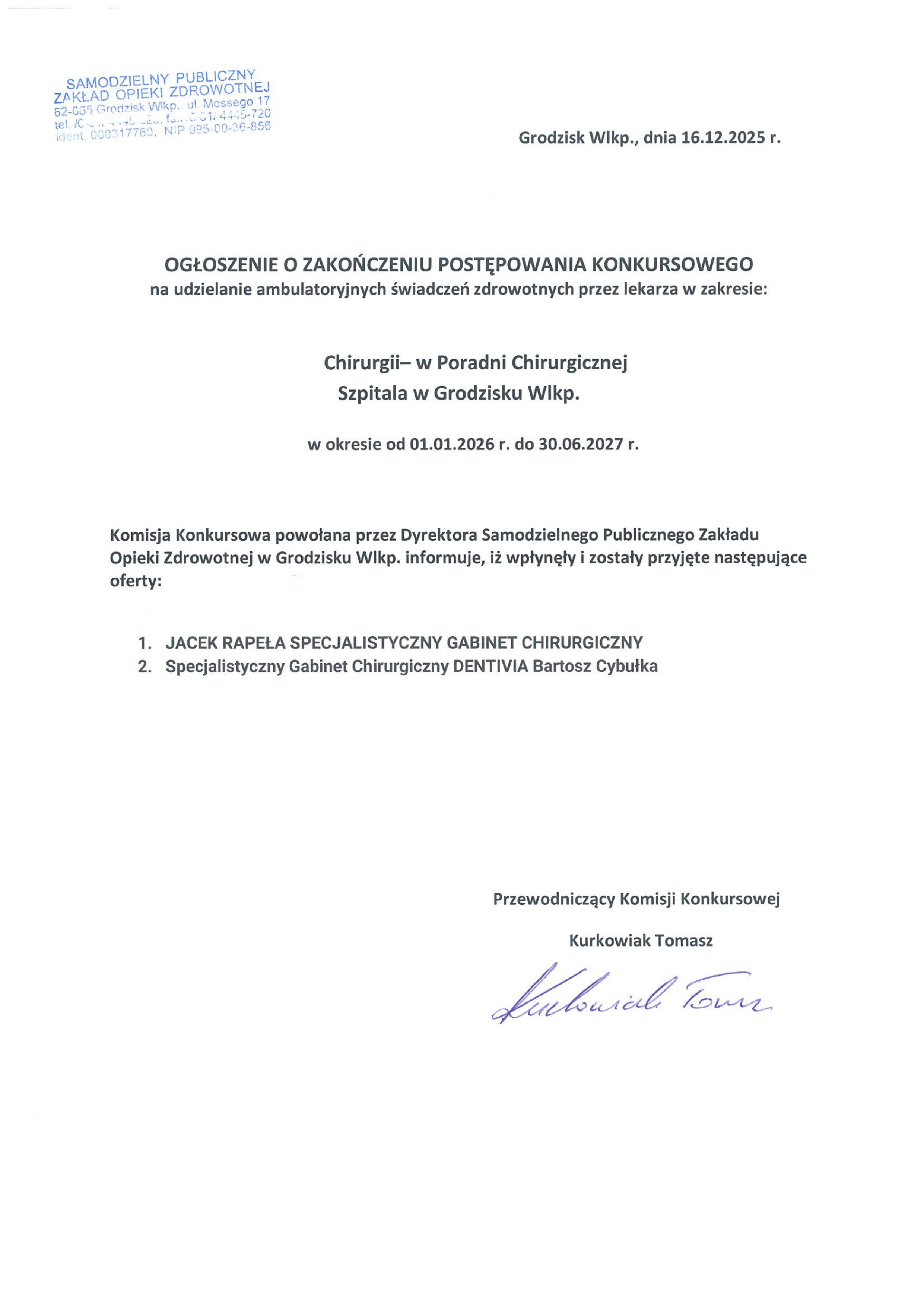 Rozstrzygnięcie konkursu - Poradnia Chirurgiczna
